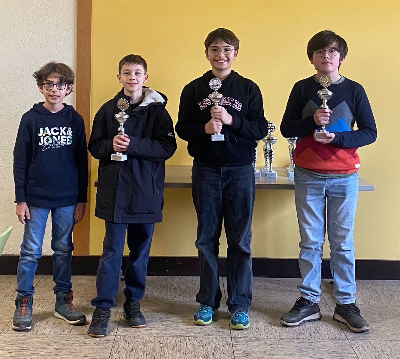 Unsere Paradeklasse in diesem Jahr war eindeutig die U16. Von den 27 Teilnehmerinnen und Teilnehmern kamen fünf aus Lendersdorf und alle konnten sich in der oberen Hälfte platzieren. Malte Weber, Eric Peters und Arvid Lange erreichten alle 5 von 9 Punkten und belegten die Plätze 8, 9 und 11. Die beste Leistung zeigten aber die Zwillinge Arthur und Mateus Maciaszczyk, die den ersten Platz unter sich ausmachten. Am Ende erreichten beide 7,5 von 9 und Arthur holte sich mit einem hauchdünnen Vorsprung von einem halben Buchholzpunkt den Klassensieg vor seinem Bruder – herzlichen Glückwunsch!
